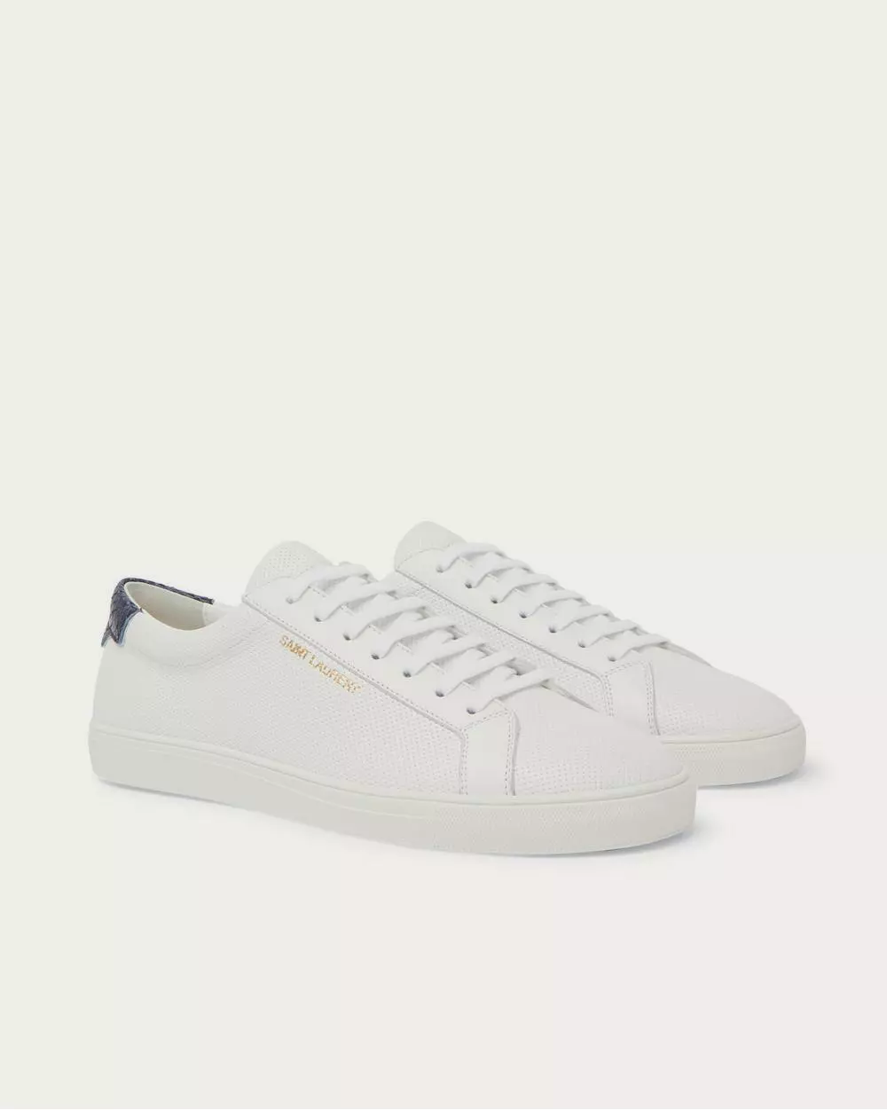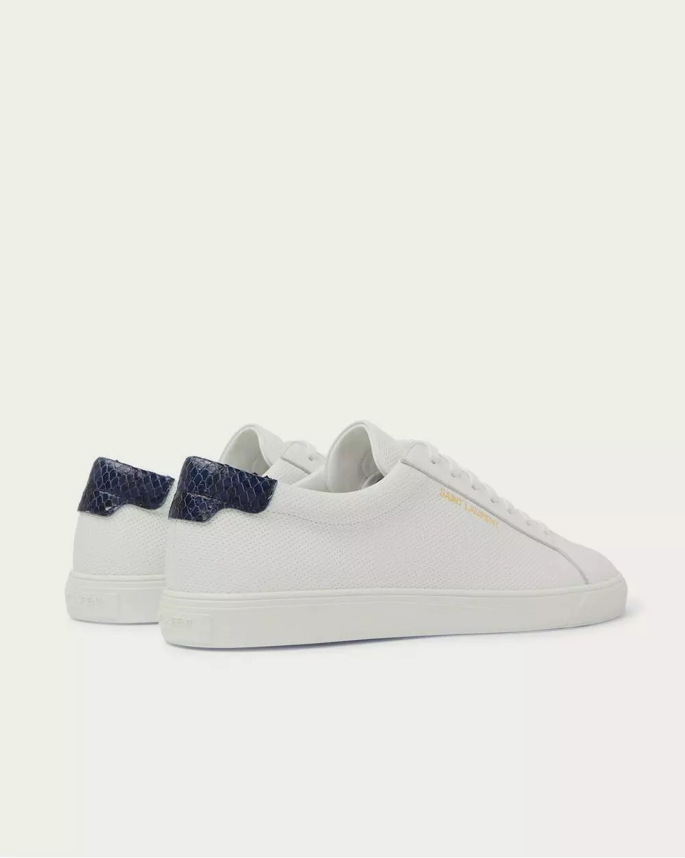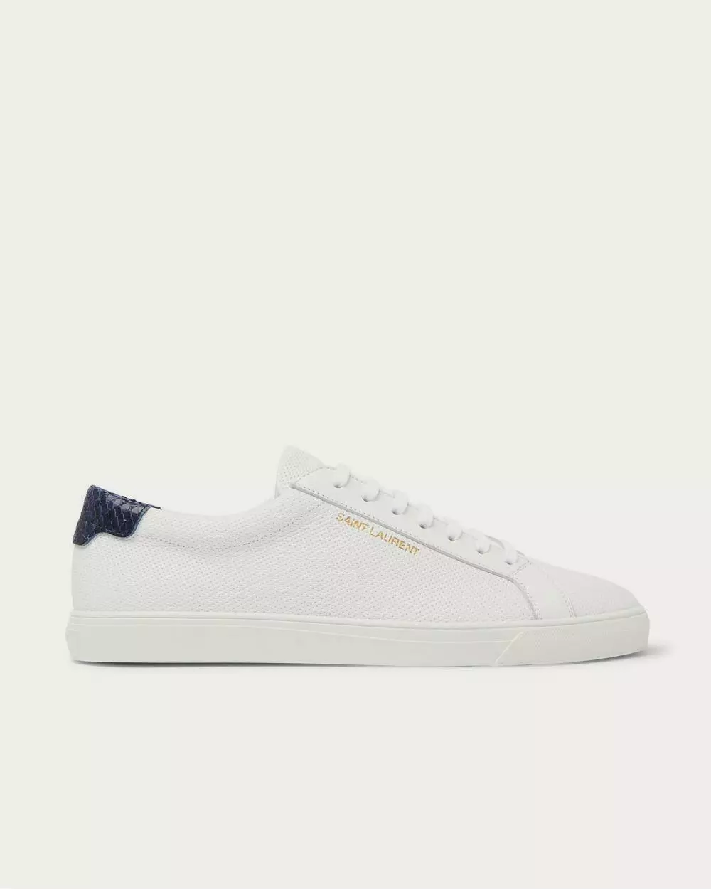 SAINT LAURENT’s ‘Andy’ sneakers are the brand’s answer to smart low-tops. This pair has been made in Italy from perforated leather with dark navy snake-effect panels at the cushioned heel tabs.