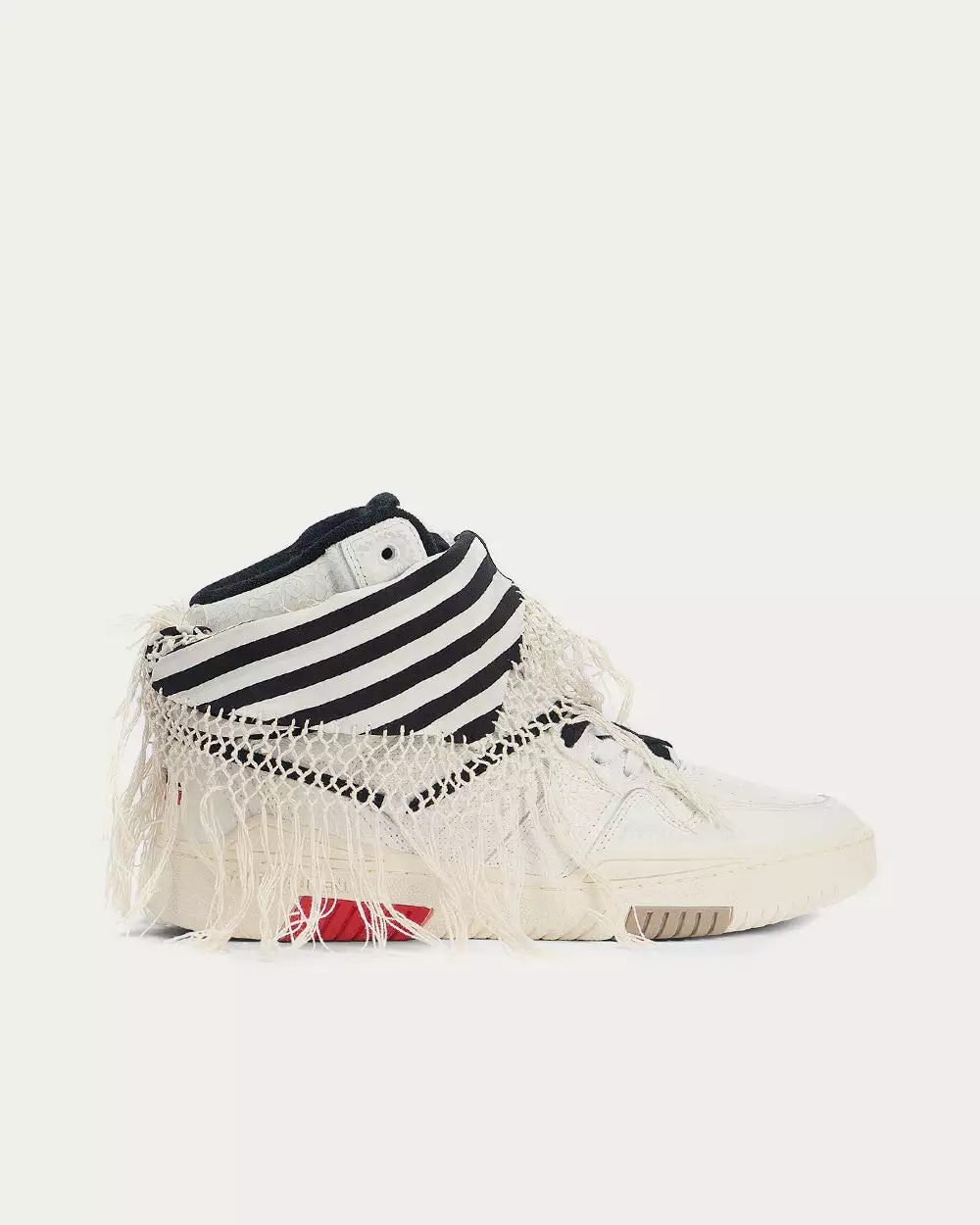 High-top laced sneakers with oversized contrasting laces wrapped around the shoe, featuring cracked and perforated leather details and a saint laurent signature embossed on the pull tab.