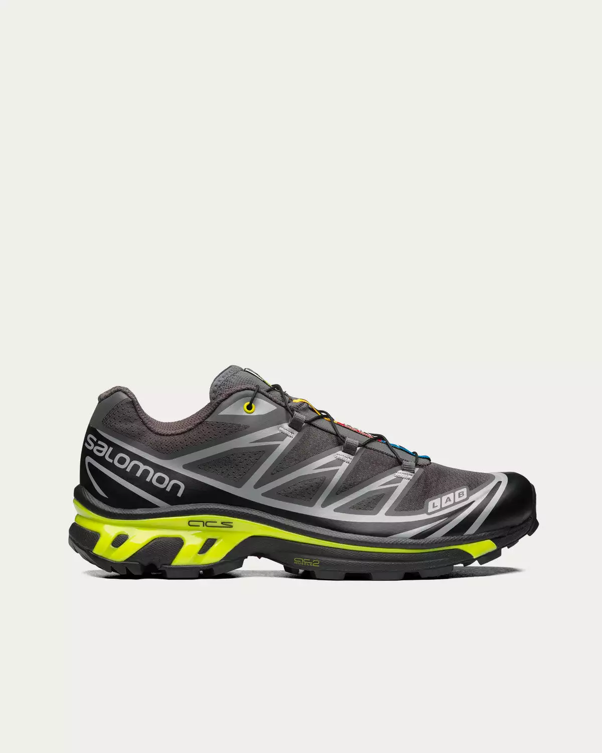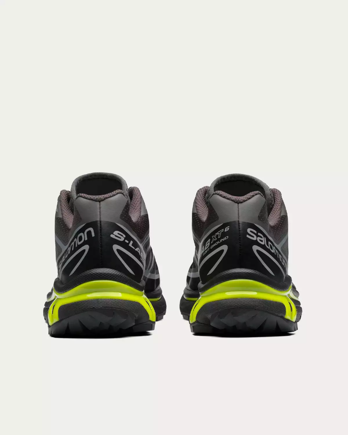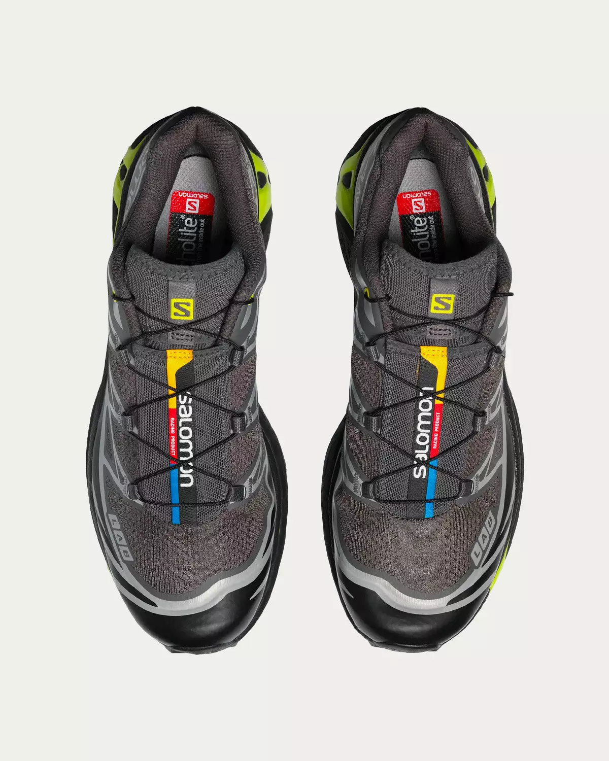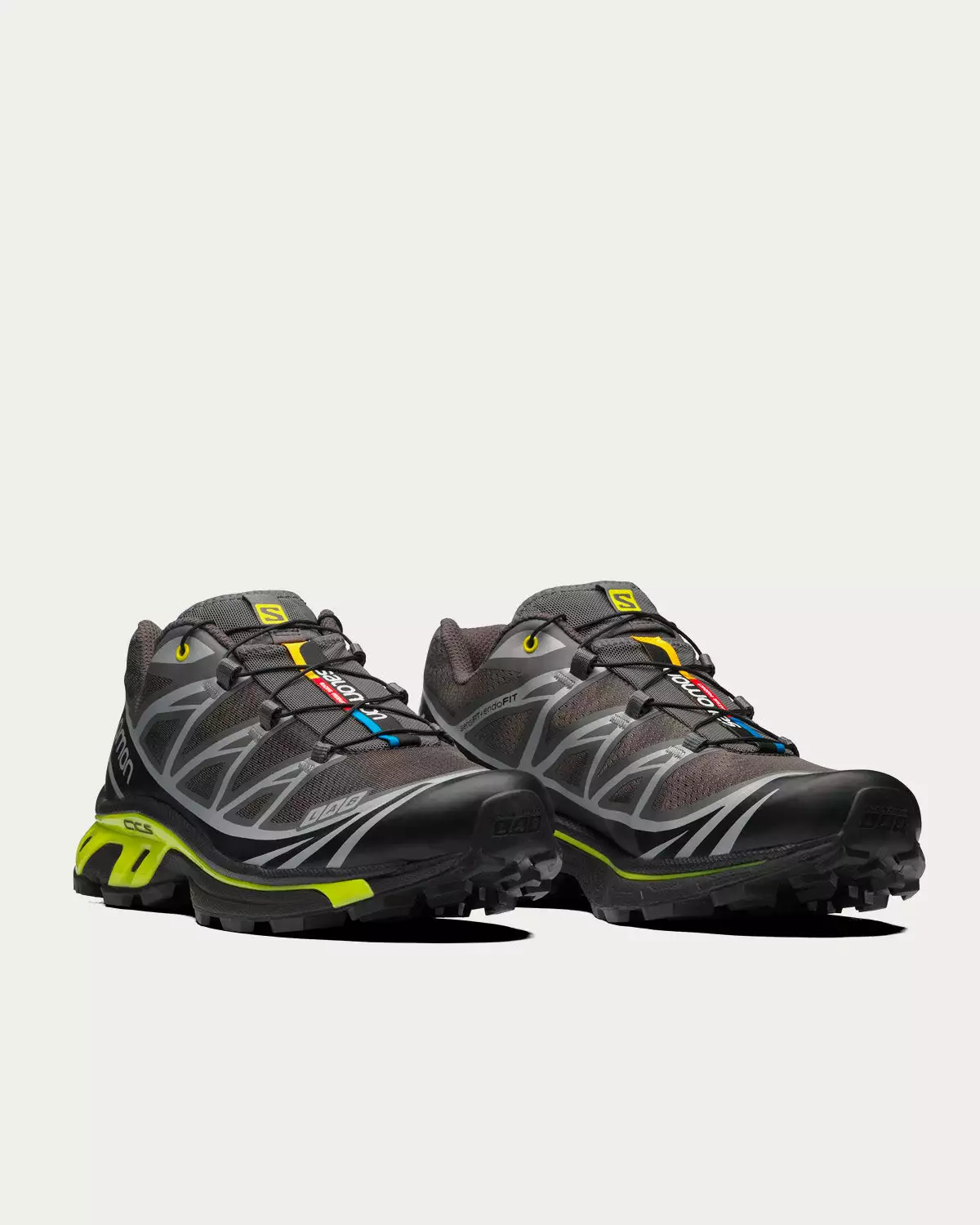 Salomon XT-6 sneakers in a Black / Magnet / Evening Primrose colourway. Originally launched in 2013, the XT-6 is the preferred footwear of world-class athletes for ultra-distance races under harsh conditions. It now returns with updated colors and materials, but the same level of cushioning, durability and descent-control.
