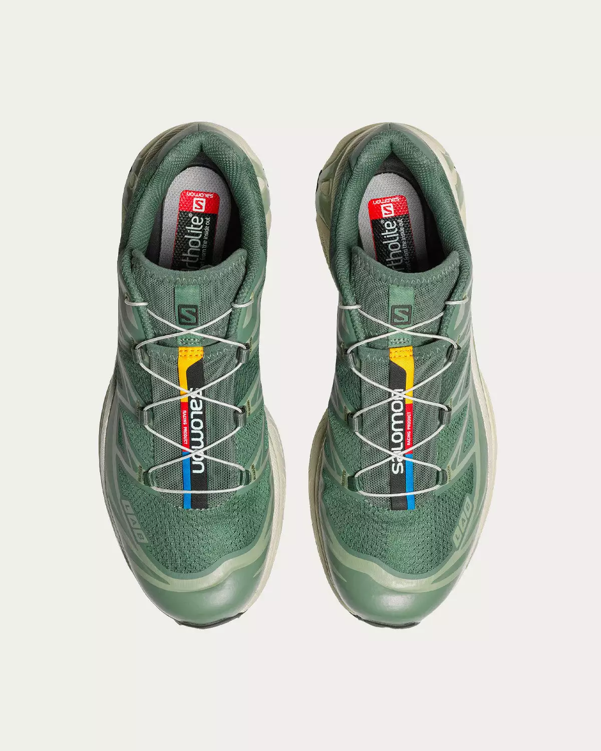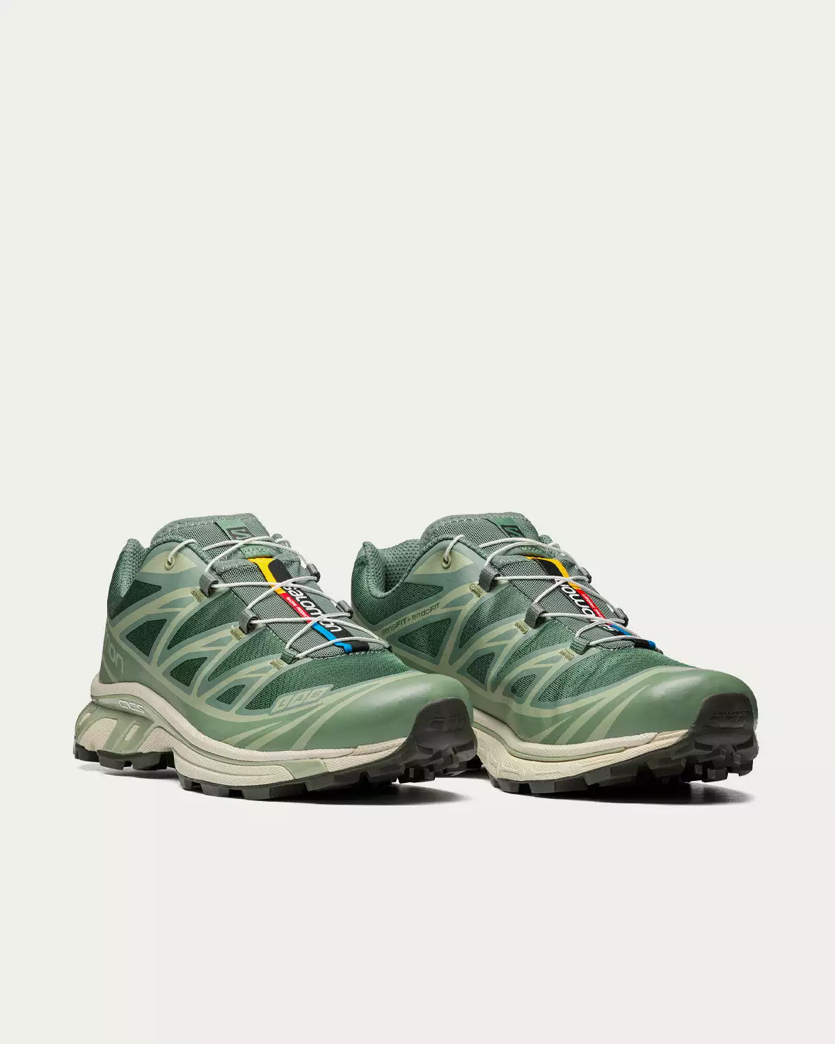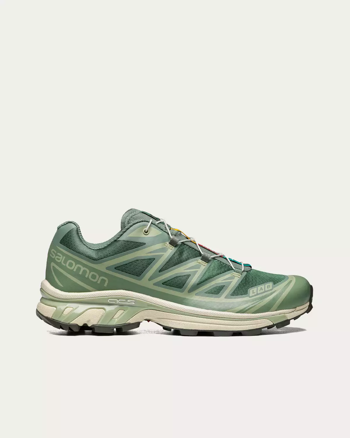 Salomon XT-6 sneakers in a Laurel Wreath / Lily Pad / Desert colourway. Originally launched in 2013, the XT-6 is the preferred footwear of world-class athletes for ultra-distance races under harsh conditions. It now returns with updated colors and materials, but the same level of cushioning, durability and descent-control.
