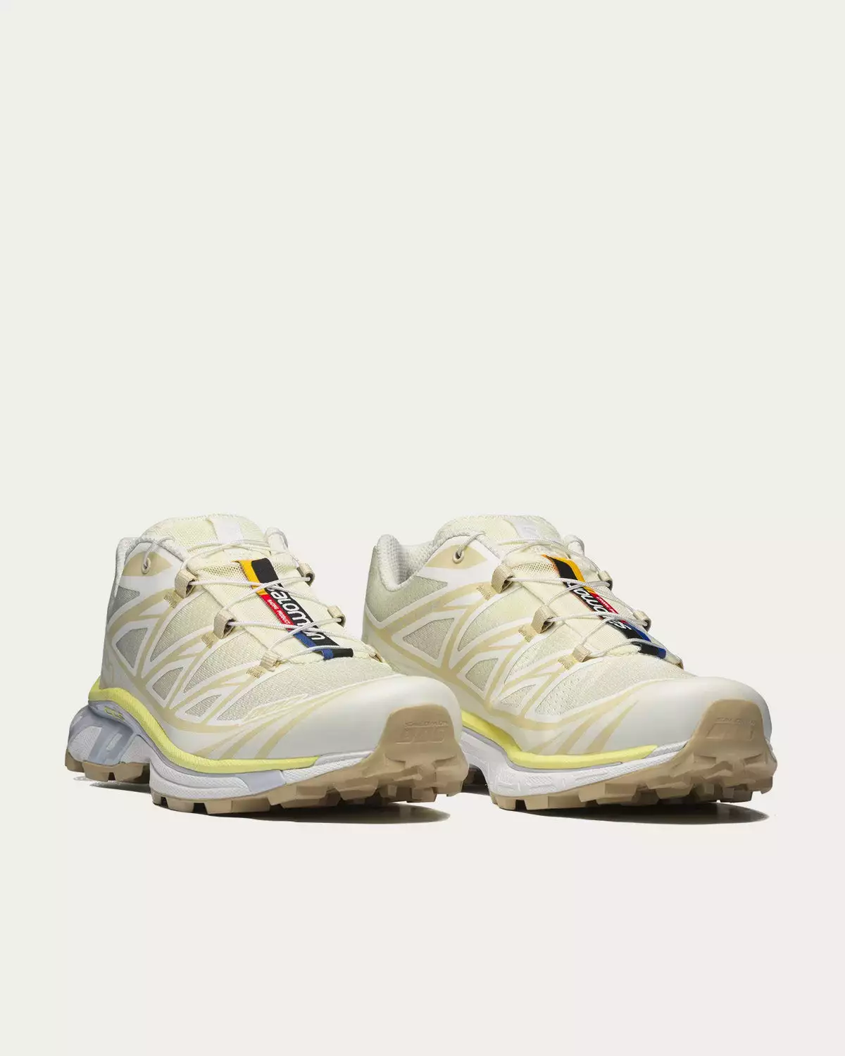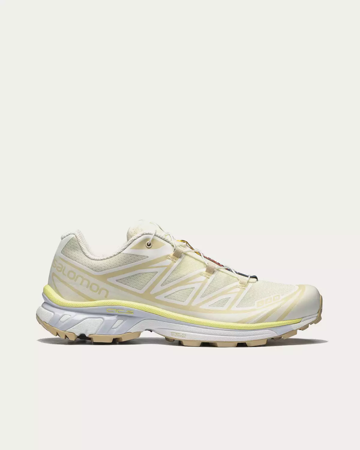 Salomon XT-6 low top sneakers in Vanilla Ice / Yellow Iris / Arctic Ice colorway. Originally launched in 2013, the XT-6 is the preferred footwear of world-class athletes for ultra-distance races under harsh conditions. It now returns with updated colors and materials, but the same level of cushioning, durability and descent-control.