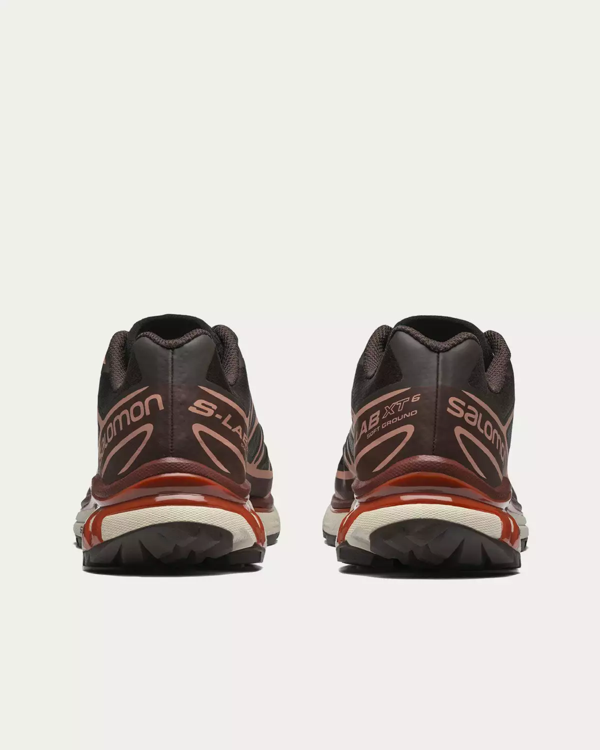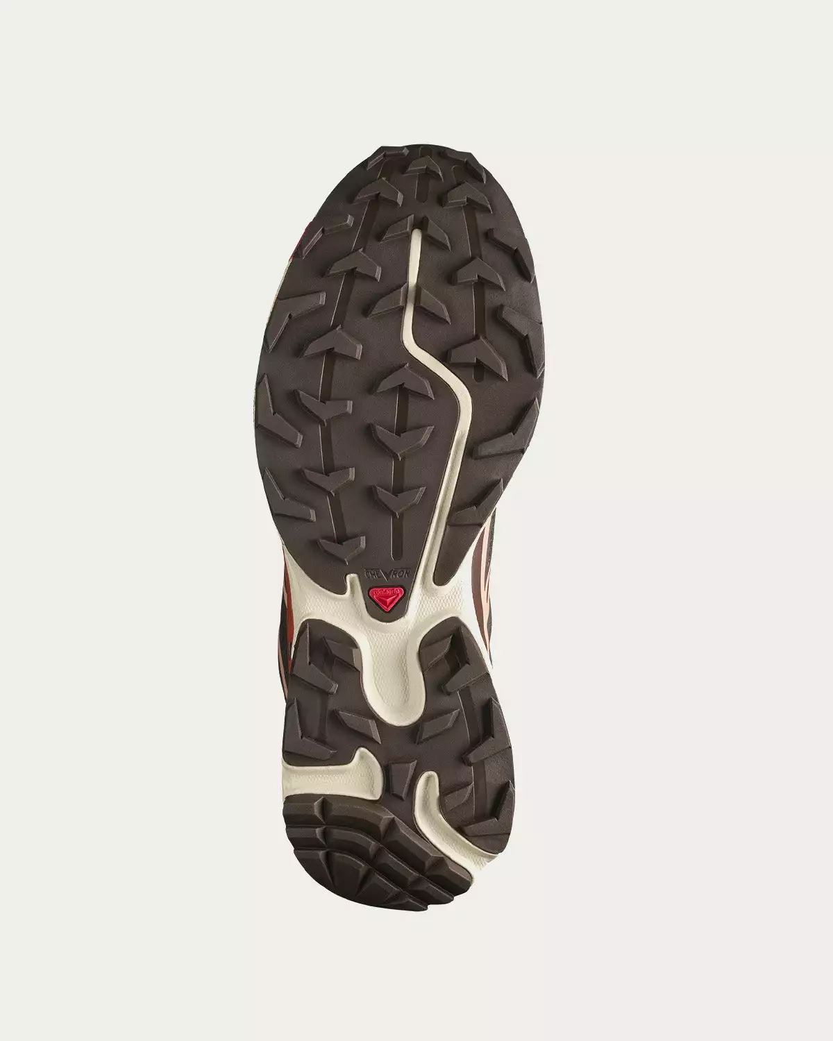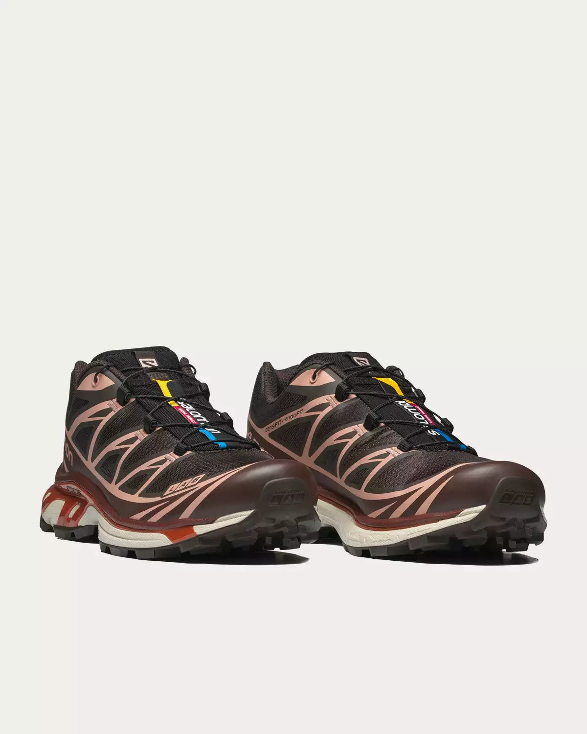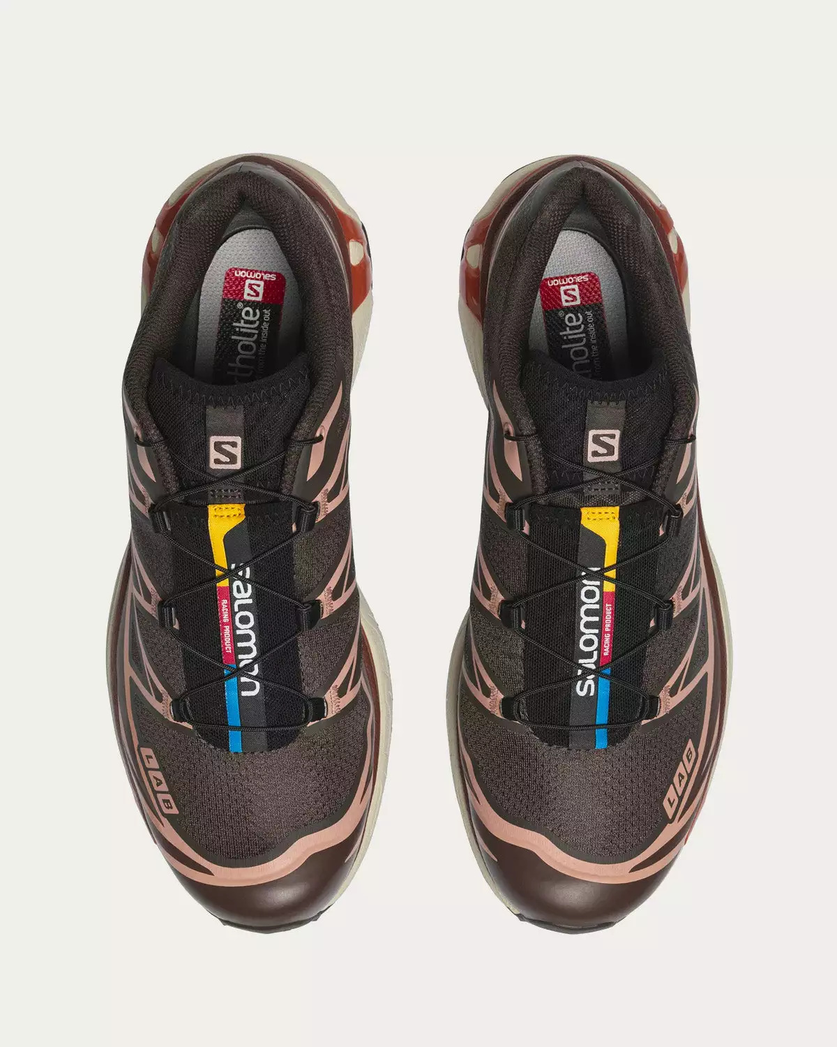 Salomon XT-6 sneakers in a Delicioso / Chocolate Fondant / Peach Beige colourway. Originally launched in 2013, the XT-6 is the preferred footwear of world-class athletes for ultra-distance races under harsh conditions. It now returns with updated colors and materials, but the same level of cushioning, durability and descent-control.