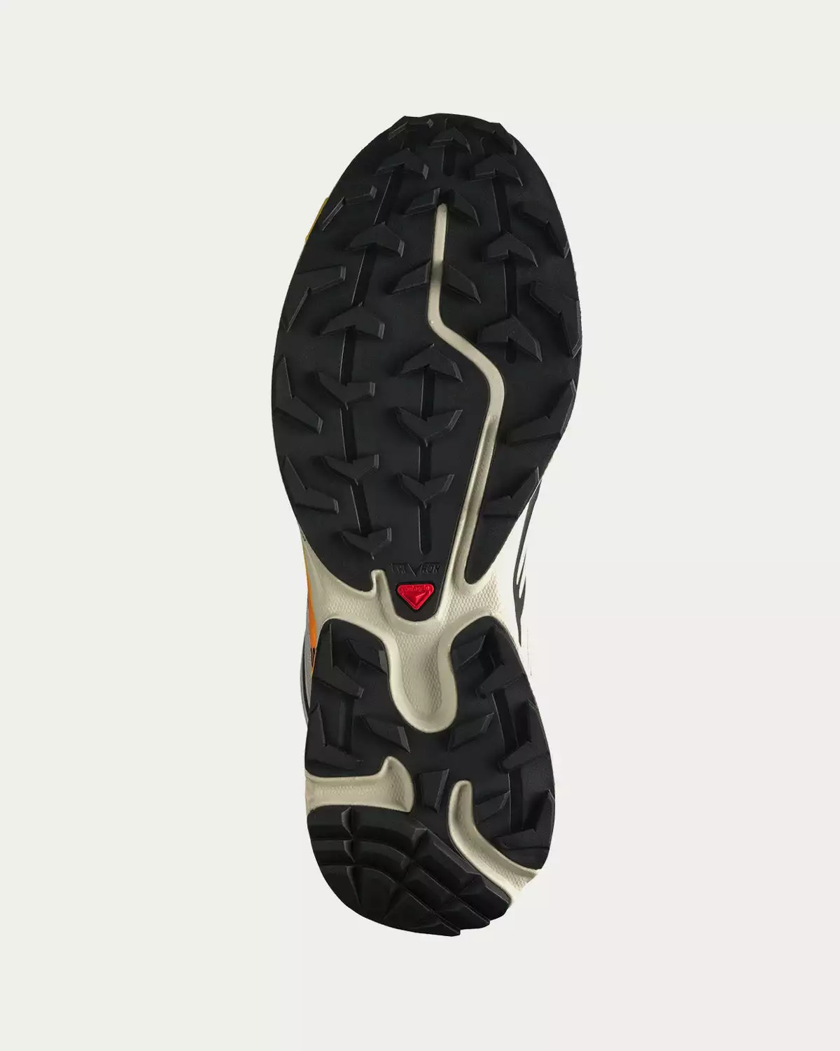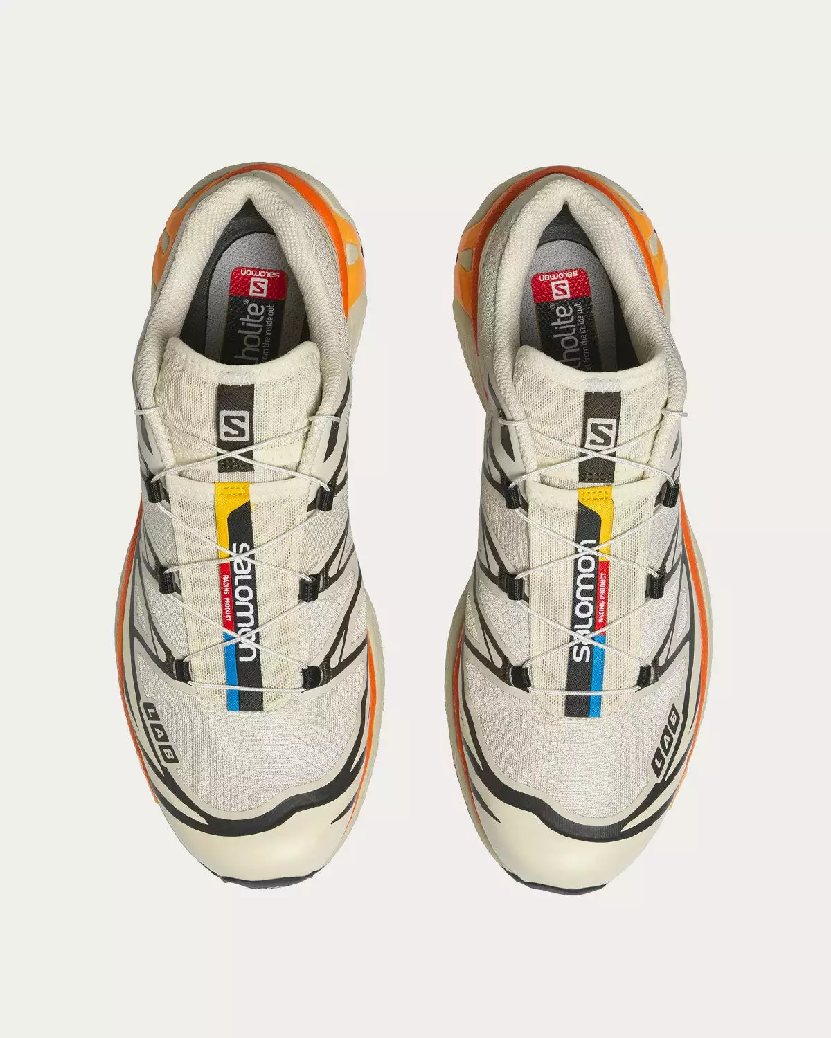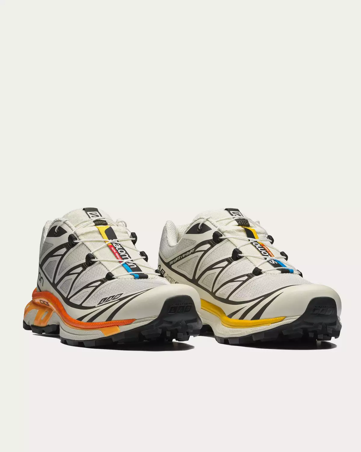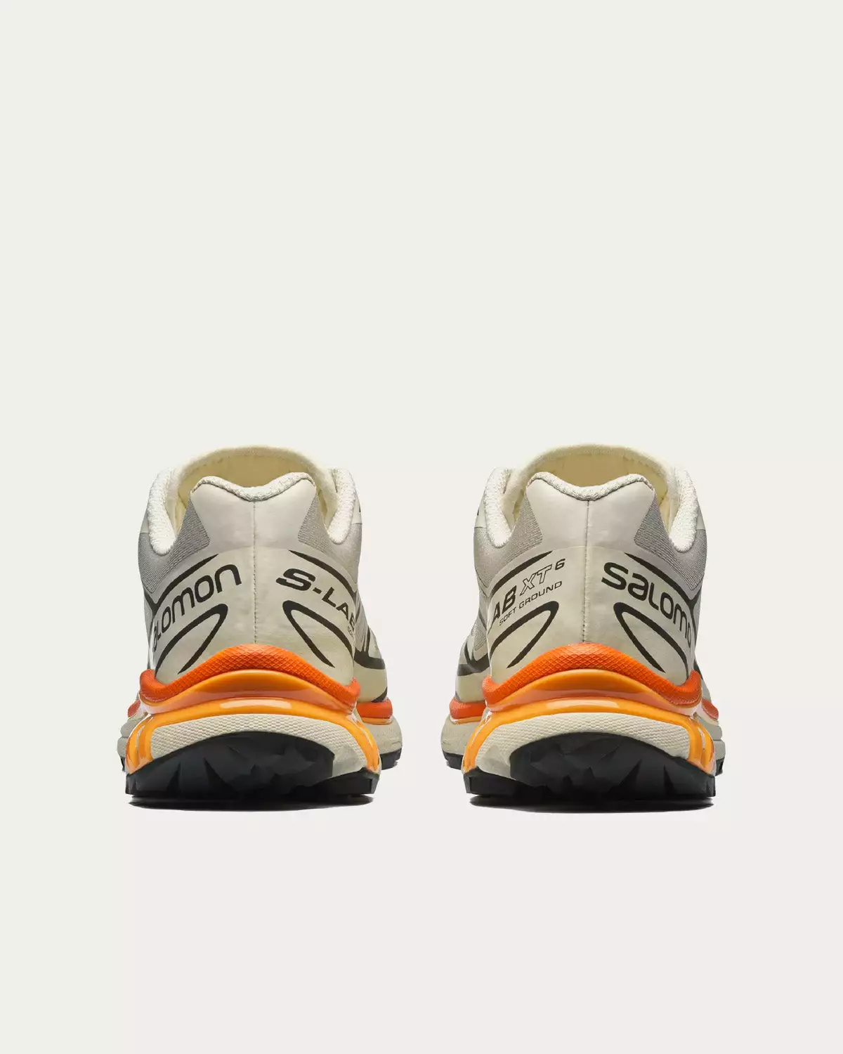 Salomon XT-6 sneakers in a Rainy Day / Delicioso / Vibrant Orange colourway. Originally launched in 2013, the XT-6 is the preferred footwear of world-class athletes for ultra-distance races under harsh conditions. It now returns with updated colors and materials, but the same level of cushioning, durability and descent-control.